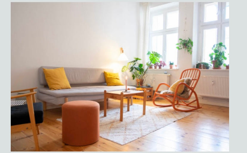 Candle burning on a shelf next to a small statue. • Art on a wall with soft sunlight hitting it. • A cozy reading table setup (lamp + flower + tray).
